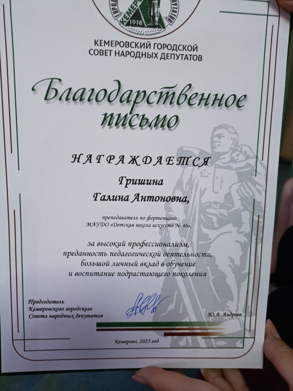 Благодарственным письмом Кемеровского городского совета народных депутатов была награждена педагог за профессионализм, преданность педагогической деятельности, большой личный вклад в обучение и воспитание подрастающего поколения!