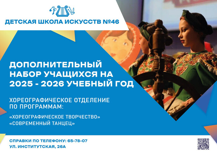 Открыты вакансии по специальностям: художественное, хореографическое творчество и современный танец на базе СОШ № 46 им. М. И. Найденова по адресу: г. Кемерово, ул. Нахимова, 250.