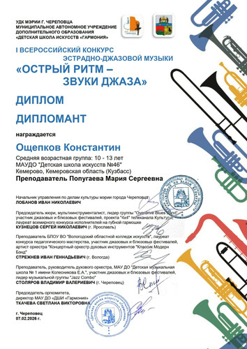 7 февраля 2026 года в г. Череповец в очно-заочном формате проходил I Всероссийский конкурс эстрадно-джазовой музыки «Острый ритм – звуки джаза», посвященный 120-летию со дня рождения Александра Цфасмана.