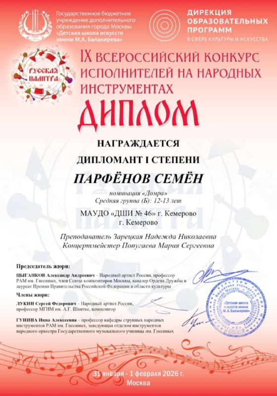 С 31 января по 1 февраля в г. Москва состоялся IX Всероссийский конкурс юных исполнителей на народных инструментах «Русская палитра».