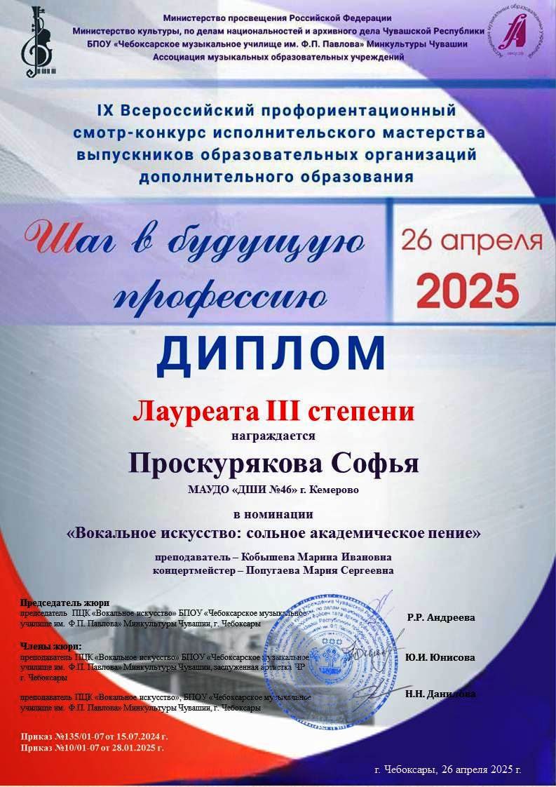 26 апреля 2025 года в городе Чебоксары на базе БПОУ «Чебоксарского музыкального училища им. Ф. П. Павлова» прошел IX Всероссийский профориентационный смотр-конкурс исполнительского мастерства выпускников образовательных организаций дополнительного образования «Шаг в будущую профессию».