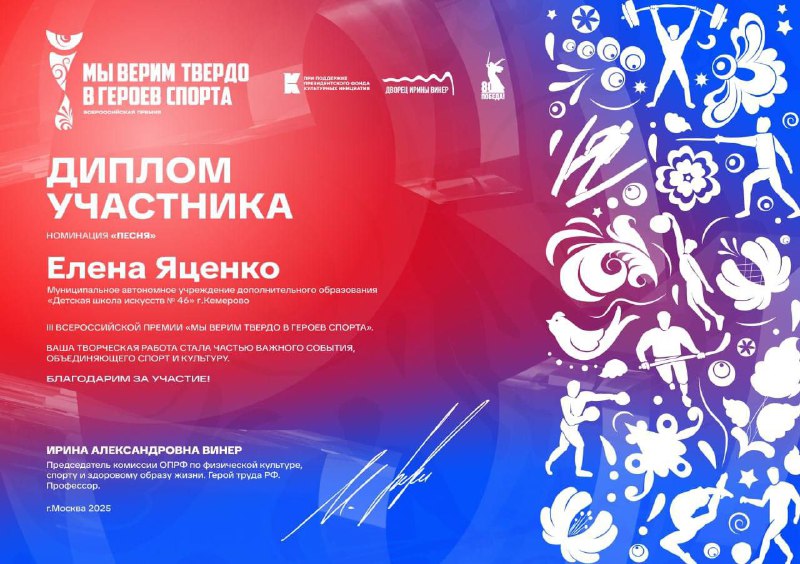 Преподаватель теоретических дисциплин, приняла участие в III Всероссийском конкурсе художественных работ «Мы верим твёрдо в героев спорта» при поддержке Президентского фонда культурных инициатив, посвященном подвигам выдающихся спортсменов — героев Великой Отечественной войны.