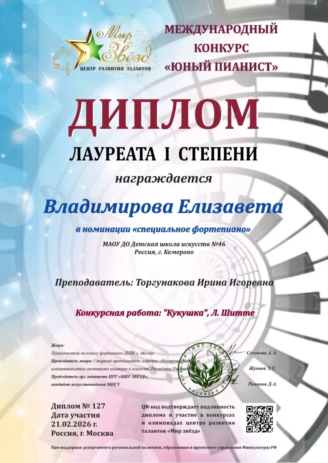 21 февраля 2026 подведены итоги Международного конкурса «Юный пианист», проходившего в г. Москва при поддержке центра развития талантов «Мир звёзд». Учащаяся ДШИ №46 в номинации «специальное фортепиано» стала Лауреатом 1 степени. Достойная победа! Удачи, творческого вдохновения и новых побед!