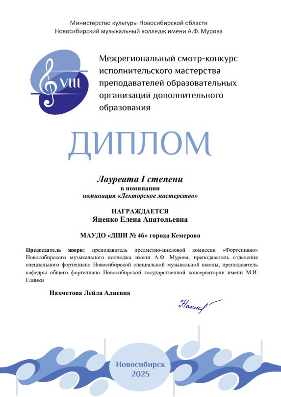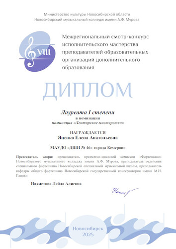 От Детской школы искусств №46 в номинации «Лекторское мастерство» от нашей школы участвовала преподаватель теоретических дисциплин Яценко Елена Анатольевна. Педагог достойно представила школу, став Лауреатом 1 степени.
