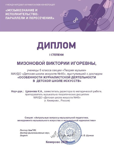 По итогам конференции ученица секции «Теория музыки» ДШИ №46 ученица награждена Дипломом 1 степени, преподаватель — благодарственным письмом.